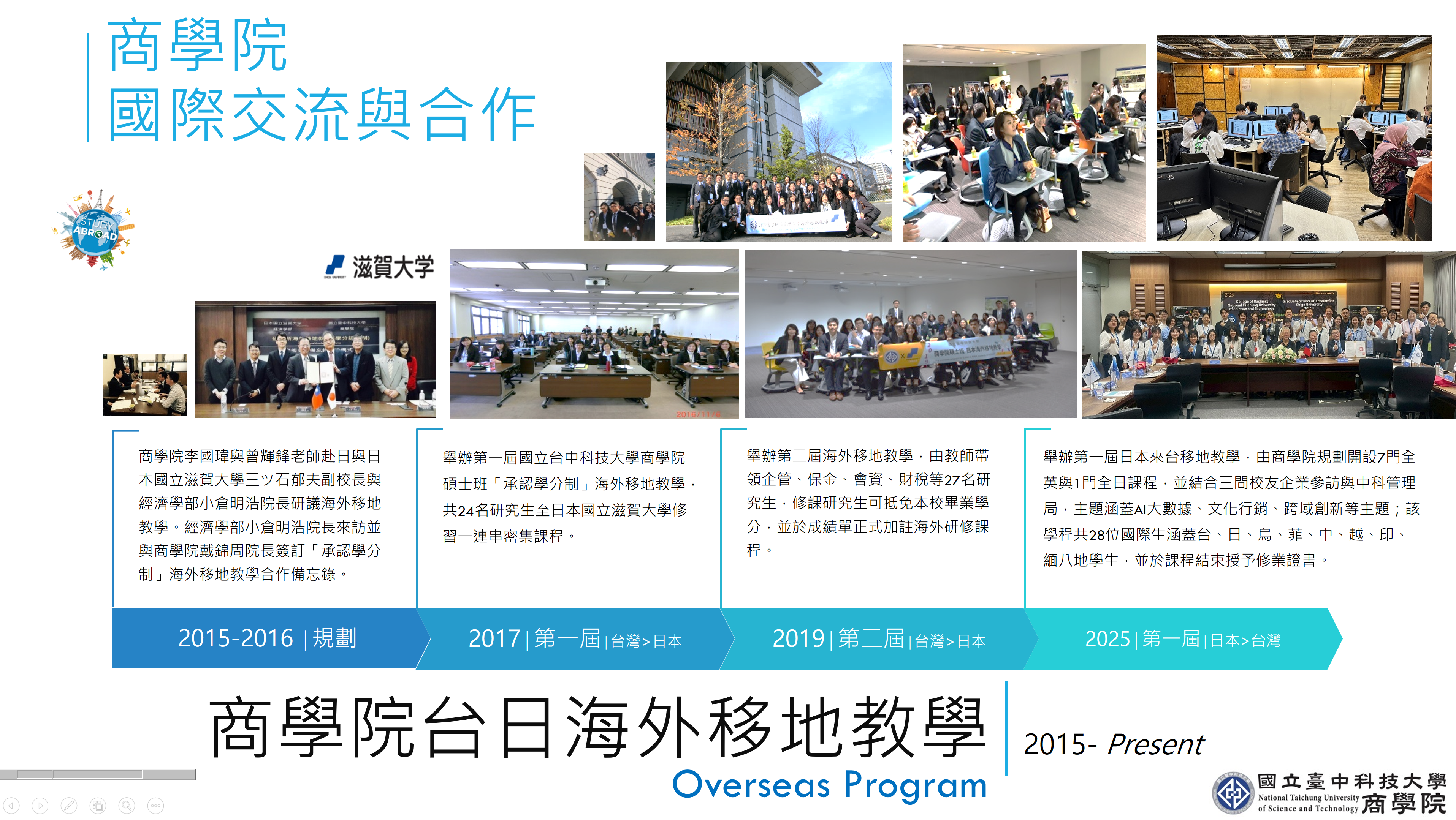 在前期交流基礎上,商學院於2017年正式推動第一屆與滋賀大學合作之「正式學分制」海外移地教學,由本院研究生赴日本滋賀大學修習相關課程並取得學分。透過學生實際進入日本研究所課程體系學習,不僅使學生能直接接觸不同國家的教學方式與研究環境,也使雙方在課程設計、學分認定與學術品質標準等制度面建立實際運作經驗。此一合作模式亦成為商學院推動國際化教學的重要里程碑。活動成果請見 https://business.nutc.edu.tw/p/404-1046-89975.php ;2017年出國報告書下載 :