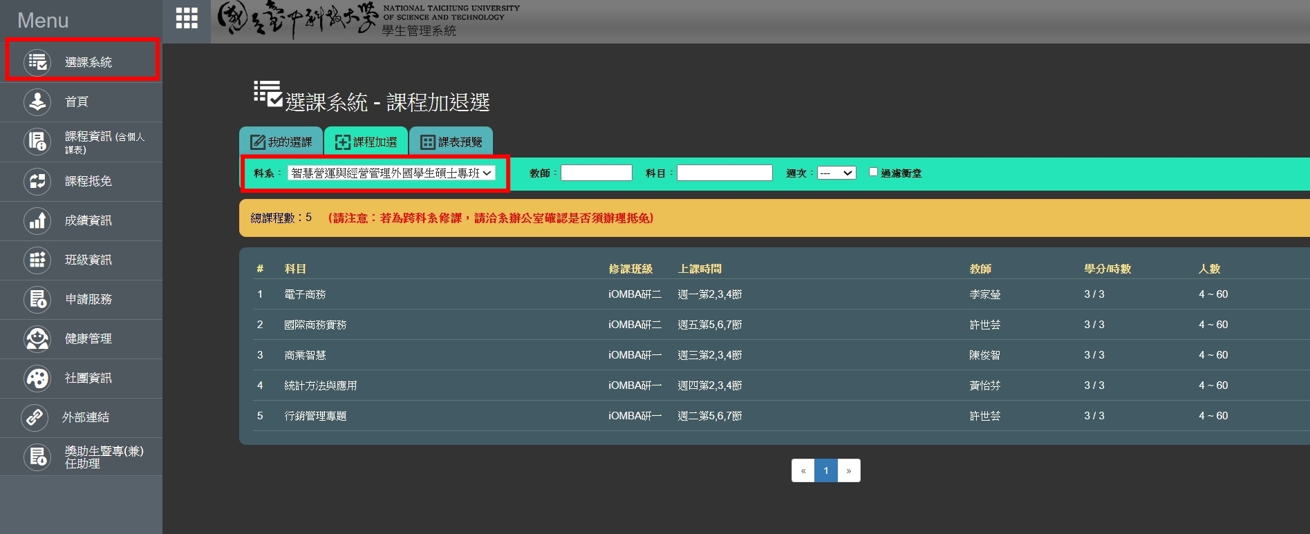 進入選課系統 ➡ 課程加選➡ 科系 ➡ 智慧營運與經營管理外國學生碩士專班 ➡ 114-1共計5門課程可選課(含碩一3門與碩二2門)