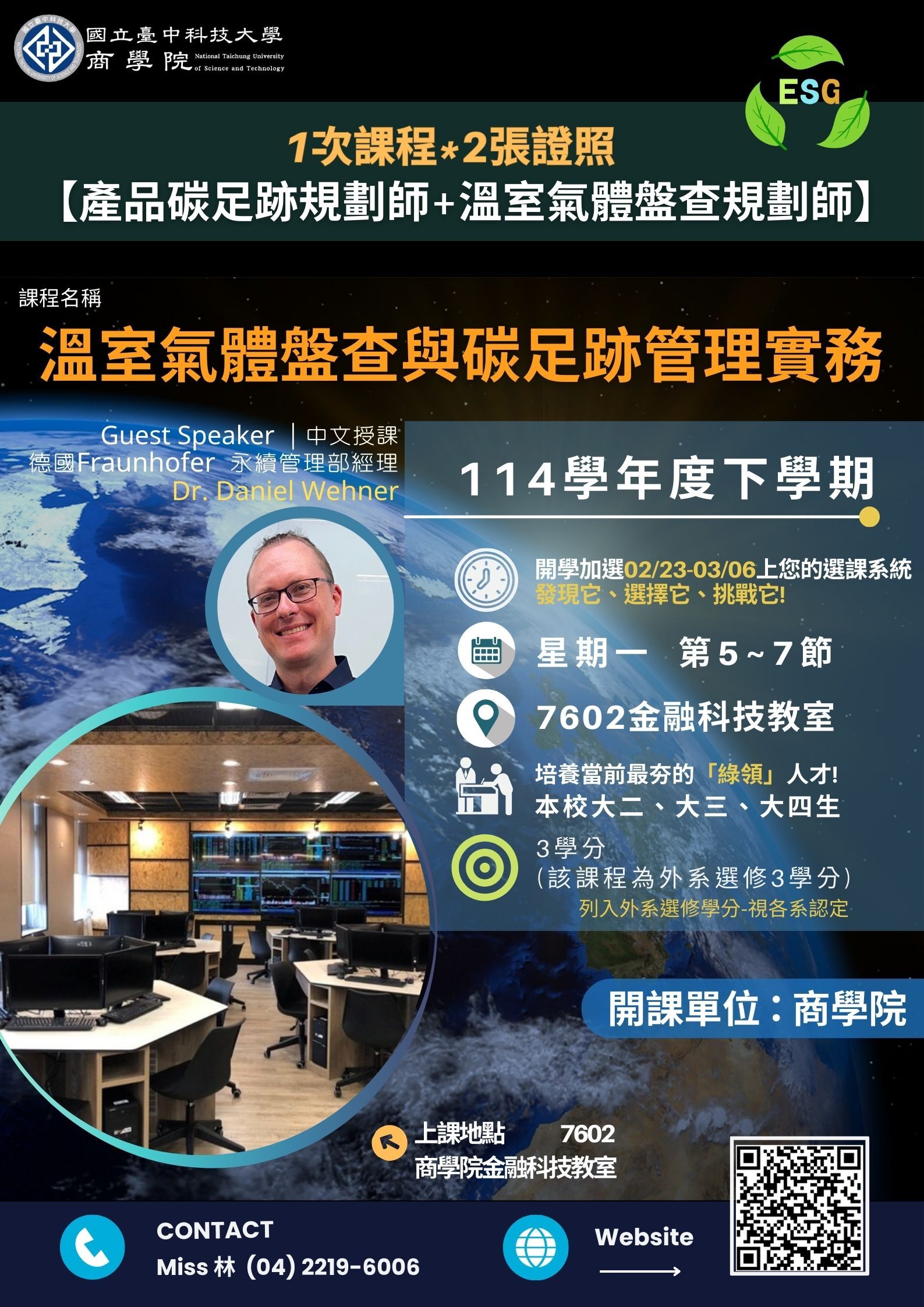 商學院「溫室氣體盤查與碳足跡管理實務」課程(114下) 12/1-12/14開放學生預選!