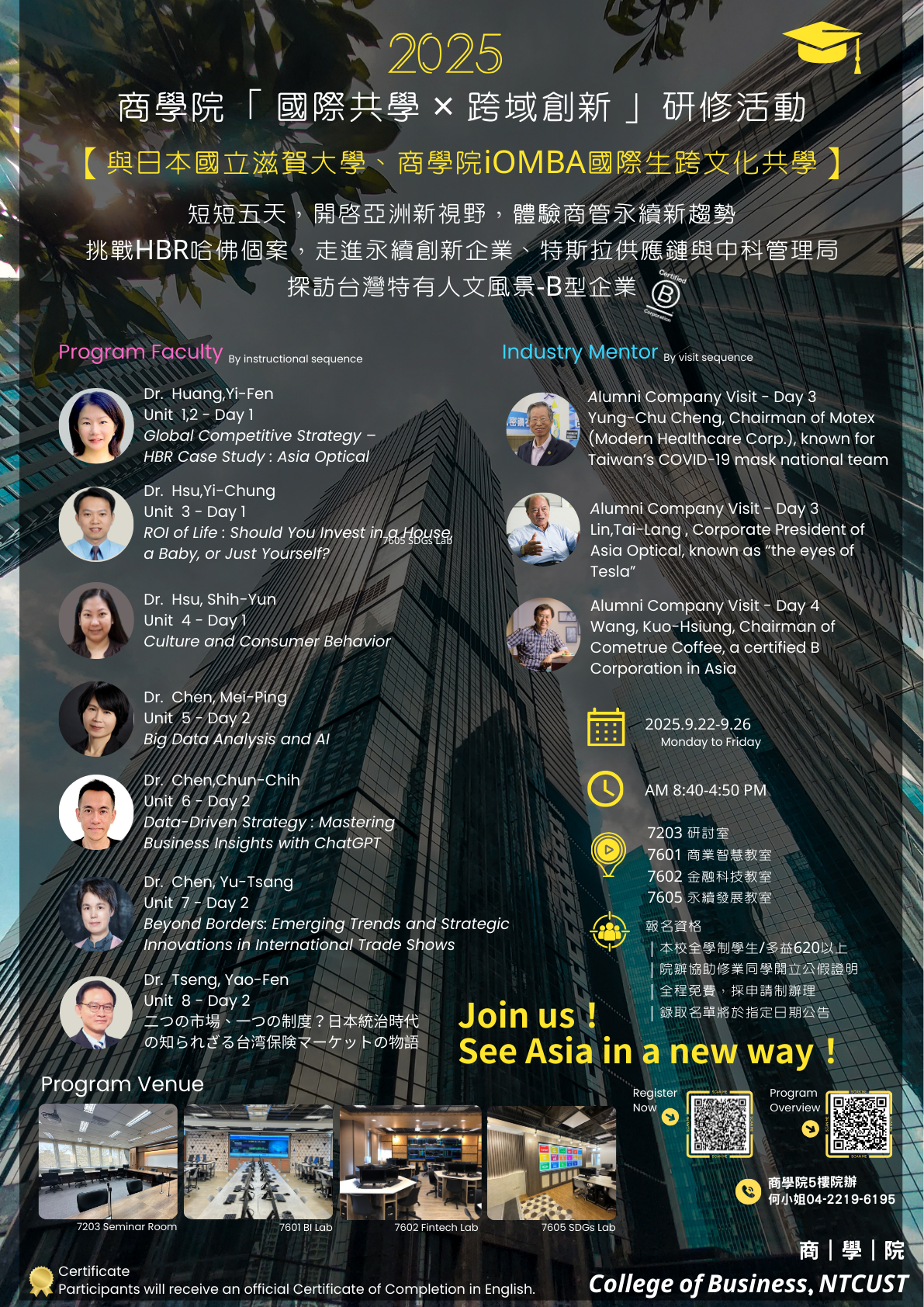 Open to NTCUST COB students (TOEIC 620+), iOMBA students, and Shiga University grad students