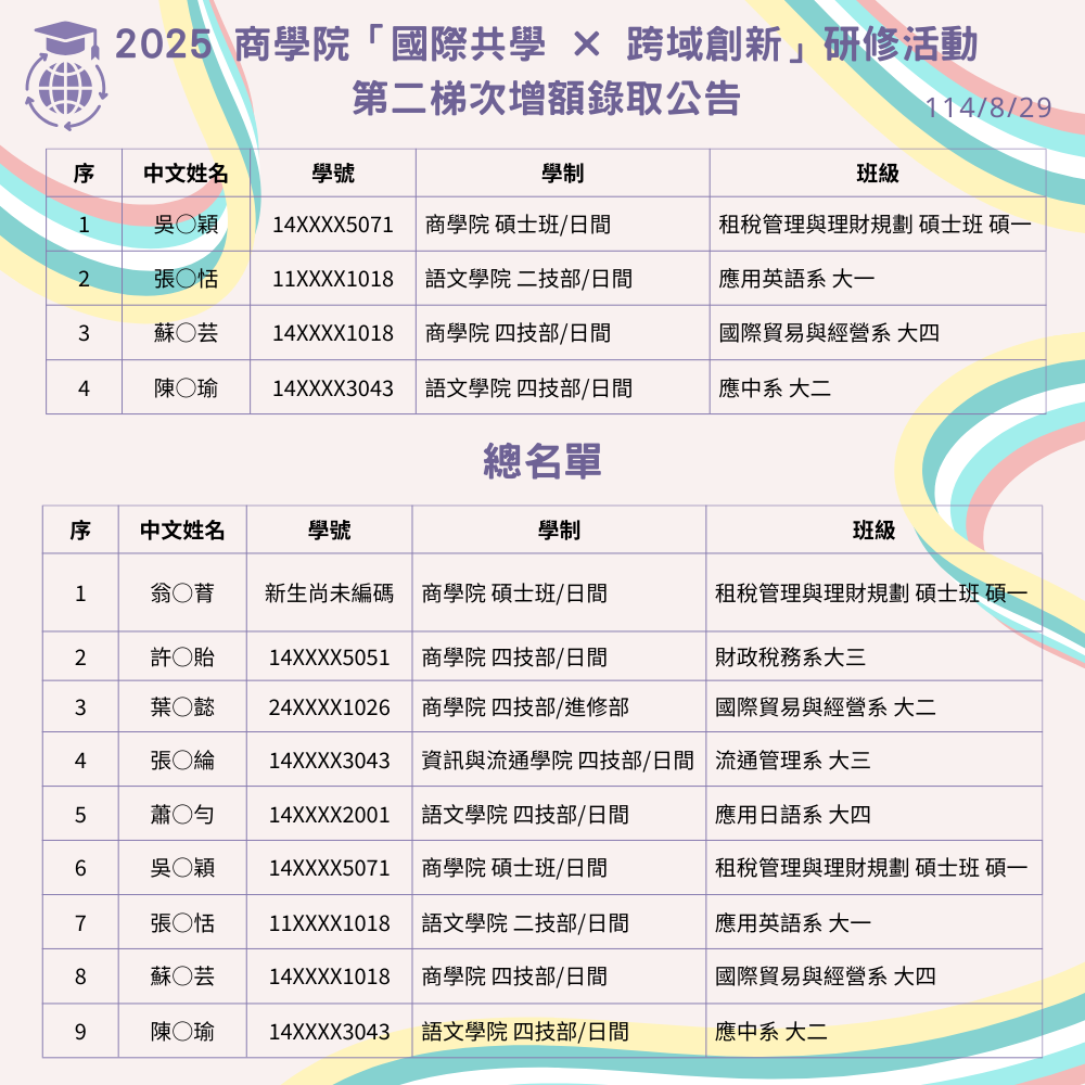 【第二梯次錄取公告-增額通知】2025 商學院「國際共學 × 跨域創新」研修活動